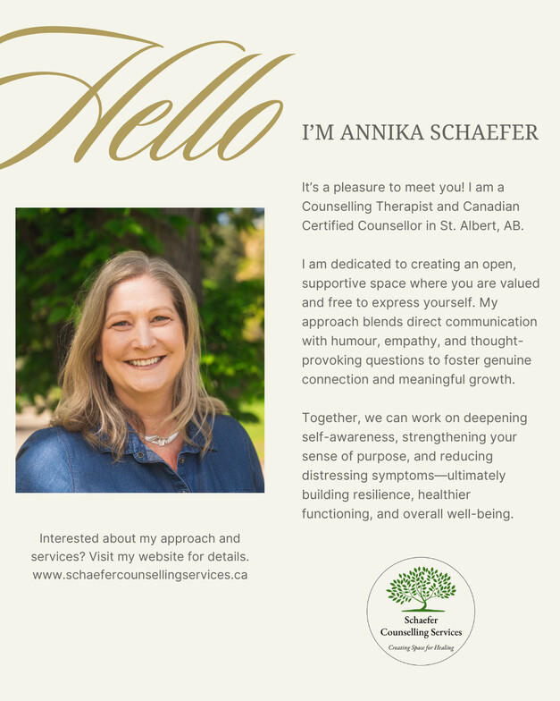 Hi, I’m Annika, a Counselling Therapist and Canadian Certified Counsellor based in St. Albert, AB. I offer both in-person and virtual sessions to support your healing journey.